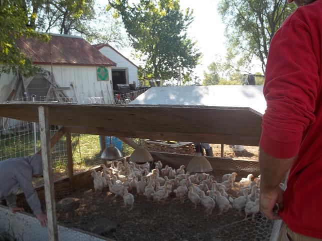 This is an 8×8 brooder with four heat lamps. The lids on each side are full 4×8 sheets. We use a Plasson bell waterer gravity fed by a bucket once the birds graduated up from the quart drinkers. Here’s a shot of the birds as we pack them off to pasture: