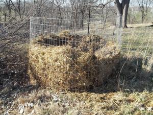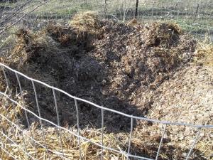 Our primary compost pile is a little long in the tooth and totally stuffed. I had to build a new pile to handle the winter bedding for goats and chickens. I began with a 5 foot ring of fencing, 4 feet tall. I piled used bedding into it but any carbon will do: straw, leaves, etc.