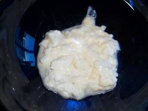 One jar was in the fridge for 9 days, 3″ of cream on the top. The wife set it on the counter. I took off the lid and replaced it with a cloth knowing the magic was about to happen. The magic happened on the counter top overnight. The milk started to curdle and change into clabber, it rose up out of the jar pushing the cloth up in a bubble. This morning I spooned out the cream portion to feed to the pigs. Here is what’s left in the jar. It’s like cottage cheese. Not much else to say.