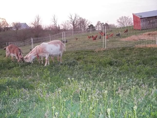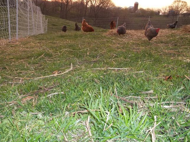 We follow the goats with chickens. They do a good job cleaning things up, scratching through dropped hay, aerating the soil, eating bugs and adding more manure. Here the chickens have been turned out where the goats were 5 minutes ago.
