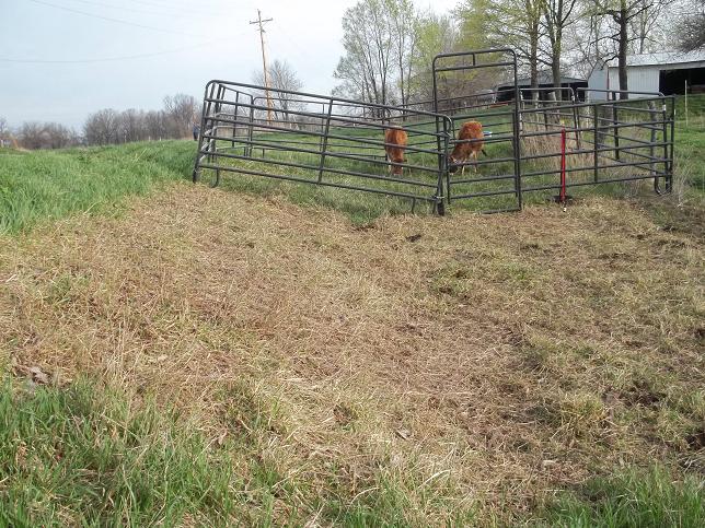Finally, you should see what the cows do to a pasture in about 18 hours. These are two 600# heifers grazing 10′ from the road in a place the highway department mowed late last summer. They are contained in a 24×24 corral so we don’t chance them getting into the road.