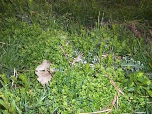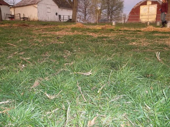 But, under the maple and walnut trees there is very little grass. In fact, it’s mostly chickweed. You can see a distinct line in the chickweed where the fence prevented the chickens from grazing.