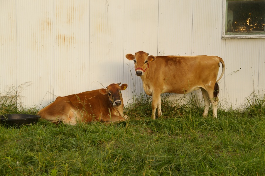 May (black halter) is expecting in September thanks to a straw.  We held off on breeding Flora (red halter) because she was a bit younger.  It struck us as a good idea to send Flora to the bull rather than bring the bull home, especially since the dairyman we bought Flora and May from didn’t mind.  Further, there was a chance that the dairyman was going to get some pretty high-priced straws in time to use on Flora.  She met the bull instead.  Anyway, off they went just in time for us to get through kidding our goats.  The cows came home again yesterday.  It’s time to stop dancing.