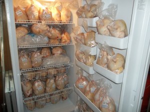 I read about guys who process 300-500 birds/day or process 10,000 birds/year. Salatin says he processes 30,000. I can’t imagine how they chill all those birds. Those two freezers are putting out a lot of heat right now. Maybe walk-in coolers can handle it better.