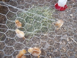 We give them broiler mash in trays for the first few weeks.  I want to get them off to a good start.  After day two they get creek sand to get their gizzards off to a good start.  We try to give them constant access to fresh greens.  Today I dropped in two big handfuls of alfalfa chaff from the hay wagon.  Just like you, chicks need to eat their greens.