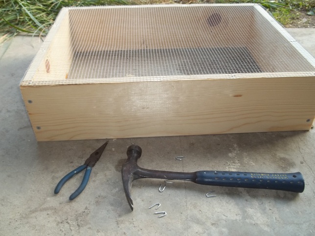Then tack on some 1/4″ hardware cloth.  This lets the worms through but keeps the compost from falling out when you carry it.