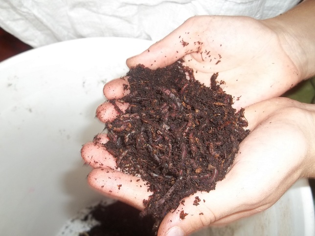 The worms crawl up the stack, eating as they go, leaving their castings behind.  We try to fill a box each month and harvest a box each month but it varies…like all biological things.