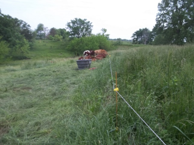 If the cows are allowed to run the pasture in a set-stocking situation, they will find places where soil nutrition is high and the grass tastes good and will eat it down to the roots.  They will find stands of bluegrass, bromegrass, rye, clover or wild oat and they’ll eat it all each time it begins to recover.  They will find tasty saplings and eat them as fast as they can recover.  Over time I’ll be left with a pasture full of cow paths, weeds, briars and thorny trees that tolerate grazing well, not to mention fescue.  I will have very little clover, very little wild oat, very little rye or bromegrass.  I say this from direct observation.  Left to their own, cows will travel long distances (making paths) for one little bite of grass.  The sod will be poor as the root systems won’t develop to their potential.  Manure will be largely concentrated in the loafing areas.  Loafing areas will be compacted.  I could keep going.  I am describing my farm as I bought it. Grazing a mob, the cows ignore a fair portion of the fescue I offer them but they do eat some along with other, tastier forages.  The animal density puts a hoof print in at least every square inch, manure in every square yard and more is better.  Then they are forced to move on, leaving manure, trampled waste and stubs of tasty forages behind for 40-90 days.  In those 40-90 days those forages have an opportunity to fully recover.  They may even develop a seed head.  If I have managed my grazing correctly, the grazing action of cattle will help those species to gain ground in their territorial battle against other species or at least fill in the spaces between plants.  I have clover where I have never seen clover before.  I have fewer thistles than I have ever seen (in fact, I have watched my cows eat thistle).  Bromegrass, rye, foxtail, wild oats start showing up in unexpected places.  Dandelions fill in the holes along with a variety of weeds I have never seen and can’t always identify…but there they are. Impact is the tool but rest is the key.  Not just the time between grazings but the time between pastures.  Almost a third of my farm is held in reserve and is outside of the regular rotation…and I will rotate that third each year.  This gives room for ground nesting birds to do their thing, allows native prairie grasses the chance to go to seed, builds deep, tangled root systems and provides a forage reserve in case of drought.  All of those things are positives.