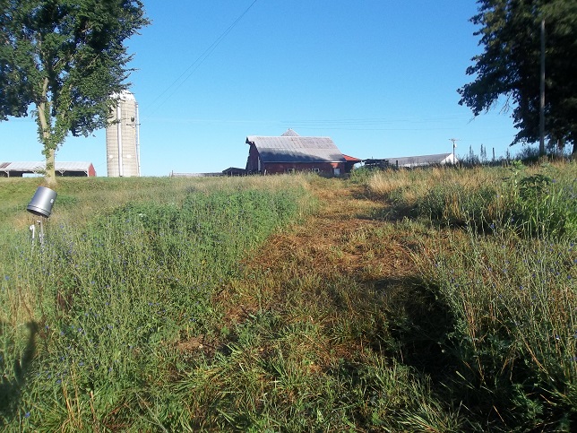 PastureWalk11Wrapping things up, walking West through the chicory field, can you see where the fence was last time I grazed through?  We had a big rainstorm and a tornado nearby the night the cows were standing to the left half of the picture.