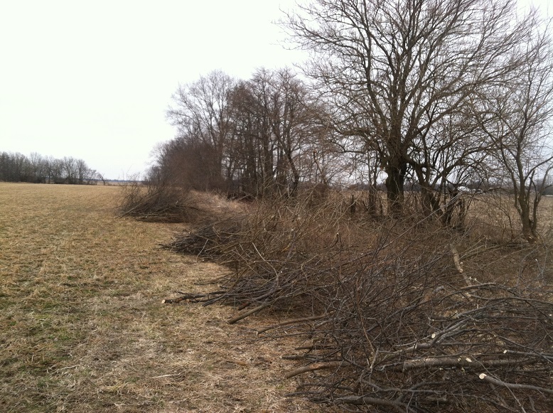 …and I kissed Julie goodbye. She was going to town to pick up the kids at her mom’s. She didn’t return until 11:00. In the meantime I dropped the trailer off at the brooder so we can haul bedding to the garden later and drove to the day’s main project, cleaning a fence row. The fence has been mostly smashed and buried by falling limbs and time but I need to at least find it. Further, I want to drop the lower tree limbs where I can, stop the trees from reaching into my field and cut out saplings that are inching into my field year by year. Again, I’m all in favor of trees, just not where I have fences. But I really can’t manage the neighbor’s side of the fence…only so much I can do. Finally, there is only so much I’m willing to do today. This is a first effort. Let’s establish a beach head. Lower limbs, nuisance species and encroaching saplings. Next year we’ll do a little more. Maybe.FenceRow1There were really only three tree species in the stand: hedge, elm and hackberry. I’m happy to burn all three but I hate cutting hedge. It is the hottest-burning of our hardwoods but what a pain. Literally. Hedge is covered in thorns. The thorns on the branches cause it to stick together like velcro. When it comes loose the limbs go on the attack. There appears to be something in or on the thorns that causes additional soreness for the next few days…especially joint pain. But there’s nothing else to do. You just have to sort of carve your way into the tree then start pulling it apart. Great fire wood though. And it’s good for bow making. And it’s a cut and come again tree so if I coppice it down to a stool I’ll have a new group of thorny sprouts the next year. That must have happened to this tree some years ago.