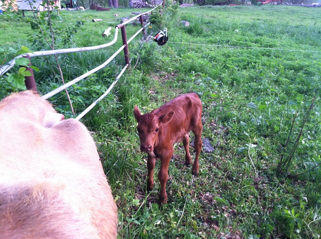 Good little guy. The kids are calling him “Steak” but I think we’ll choose something less…pointed. He is nursing well on all four quarters and running with the herd. Vigorous calf on an early May morning. What more could I want?