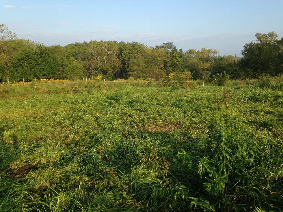 The cows are on the move. We’re trying to get them to gobble up as much of the clover and chicory and dandelion as possible before frosts arrive…and we only have about a month remaining. We are trying to convince them to skip right on past the fescue in favor of other, more fleeting morsels because the fescue will stand up to the frost. The clover will just wilt and die. We need to move fast to continue fattening our cattle before the cold weather hits. Here is a shot of a pasture they just moved into up on the flat by the hog house: