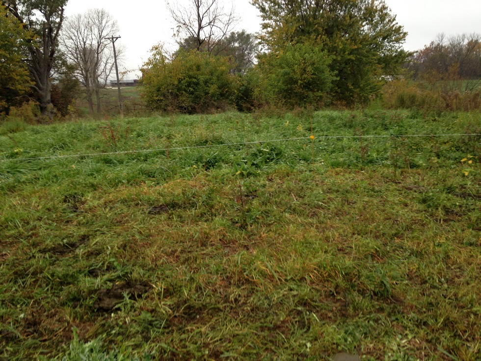 The picture is fuzzy in the early morning light but I think you can see the cows didn’t strip the grass down to bare earth. There are a few places uphill where we are asking them to help with the remodeling but here we are leaving residue. Uphill from here we have a solid stand of thistle and goldenrod with just a pinch of spiny amaranth. The cows helped us out there as you can see by the fence line.
