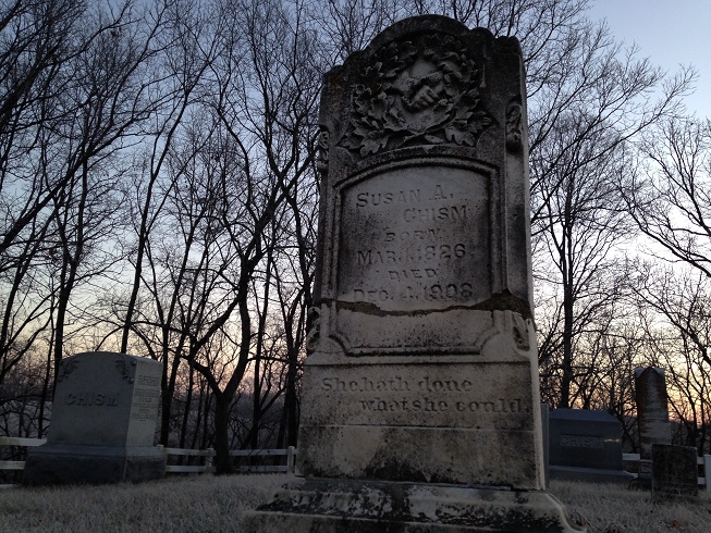 Susan was the blind daughter of William and Sarrah W. Chism. The story is she was carrying scissors and fell.