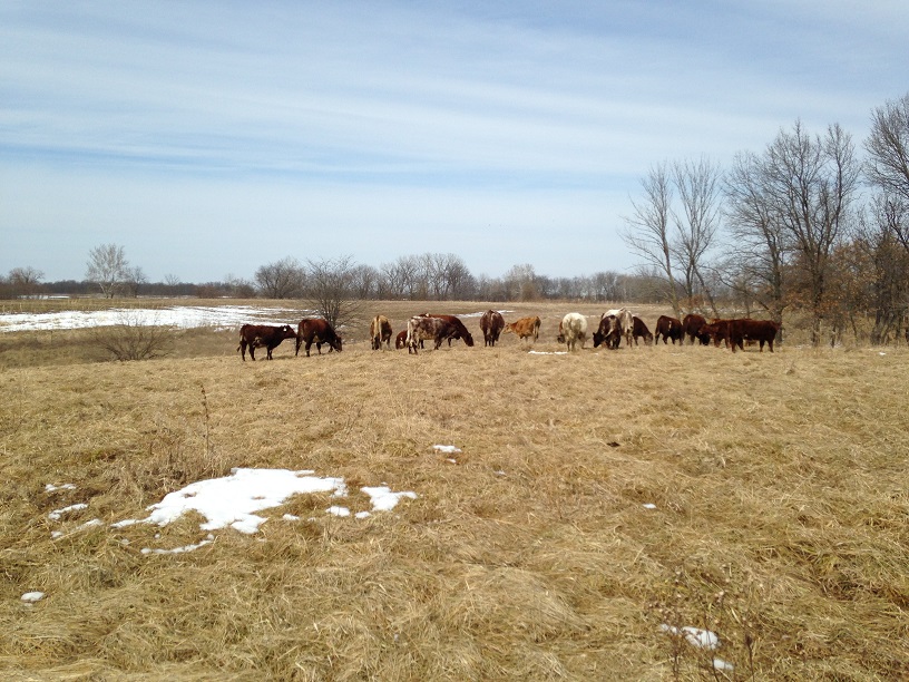 With tails and heels in the air the cows ran out to pasture today. Of course, two of them found a low place in the temporary fence and invited themselves to cross it. And to make things worse I put the heifers we weaned at Christmas back into the herd so there was a little pushing and shoving and other family reunion stuff. But then they put their heads down in fresh grass and went to work.