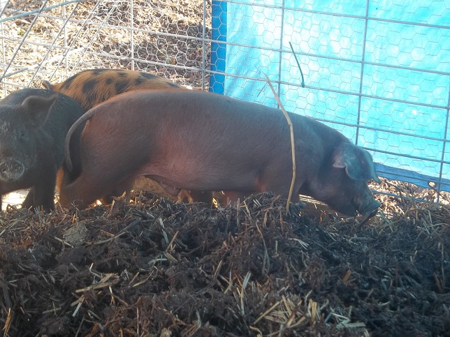 But mere turkeys are no match for a manure pile of such magnitude. It was time to bring out the big guns. I needed a pigerator. I brought another chicken tractor home from the pasture, made it reasonably pig-proof and bought some new shoats! WOOHOO!