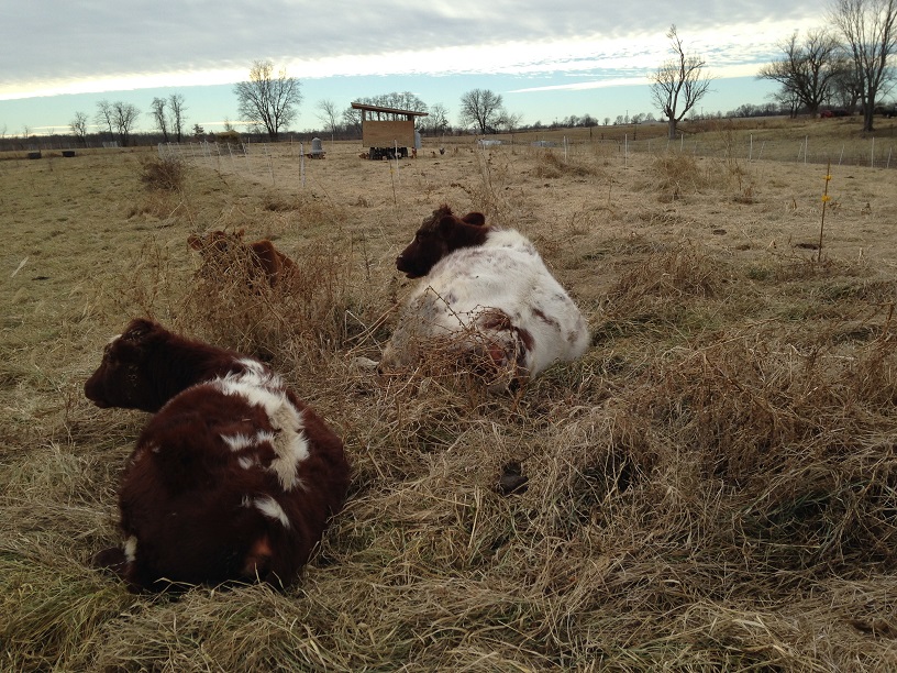 But in the winter things really heat up. Fescue comes into its own. The last thing the cows would eat during the summer becomes the last thing available to eat in the winter but the first thing they graze out. And the protein goes up as the temperature goes down, though, obviously, the feed quality deteriorates over time. The cows are currently grazing orchard grass and the remaining alfalfa in the alfalfa field. We are strip grazing our way across 17 acres we started grazing in October. At that time the alfalfa was still fresh and proved to be difficult for me to manage so we took a few weeks off and grazed…you guessed it…fescue while we waited for a hard freeze to take the edge off of the alfalfa. Now we are trying to wrap up the alfalfa grazing by the end of the month…hopefully before it gets smashed to the ground by a heavy, wet snow. The orchardgrass isn’t faring poorly but it just doesn’t seem to stand up to the cold the way fescue does. (BTW, the fescue the cattle grazed in October has recovered sufficiently for another grazing. I may have gained a week or two of pasture.)