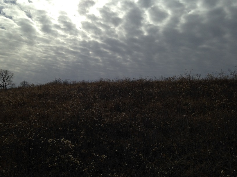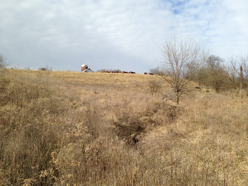 The hill to the east…um…this is getting confusing. See Julie standing in the shattercane several pictures up? (Look, I know I shouldn’t have shattercane, OK?) OK. She is south of me (Chris Jordan, photographer, farmer, gentleman, scholar). The cows are further to the south in the alfalfa field. On the left side of that picture, up on the flat, the cows grazed in the spring then dad and I cut some of the best hay we put up last year. Just wonderful stuff. It was hard to get there as the hills are steep and the valleys are deep but we cut the flat top. Oldest boy and I had to cut and drag brush ahead of dad when he was mowing. Not only was the hay wonderful stuff, I came back with I don’t know how many loads of manure and lime and covered the field. It recovered nicely and is now free of brush…like the thorny sapling pictured further up. You can see a line on the field where the mower ran. I think this is a practice we will continue. By taking a single cutting of hay and applying amendments from each field every few years I can mix up the level of disturbance in my fields…also it gives me a chance to manage things even more closely while also supplying me with the feed we need. Looks good on paper anyway.