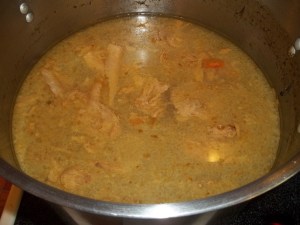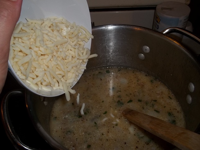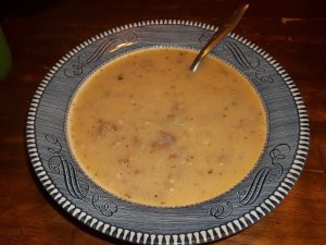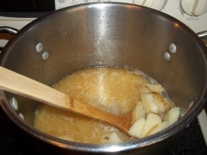 Melt butter in a microwavable dish. (We do not have a microwave, so we just melted the butter in a sauce pan on the stove top). Pour 1 cup of sugar and flour into a mixing bowl, whisking in milk. Mix well. Then, pour in melted butter and whisk it all well together. Butter a baking dish.