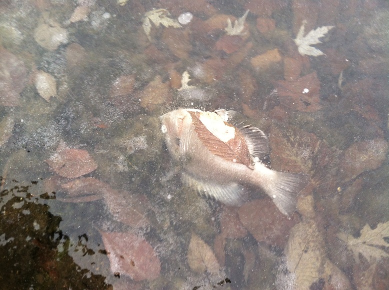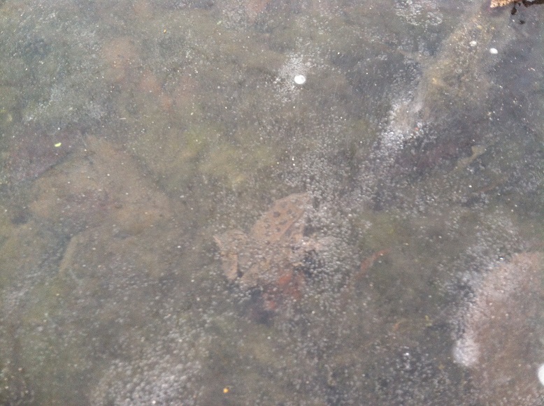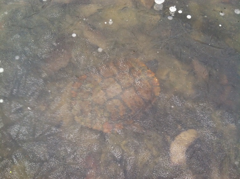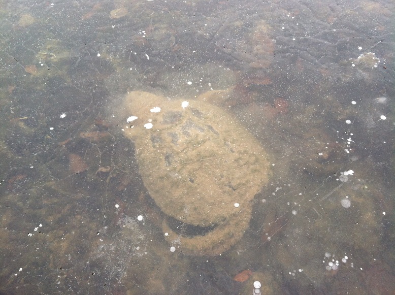 My brother-in-law and I took my children and nephews for a walk around the pond edge. The ice was nearly 2″ thick everywhere but the group of us together caused some fractures so we stayed in the shallows. We were looking for turtles. We found turtles…and more.